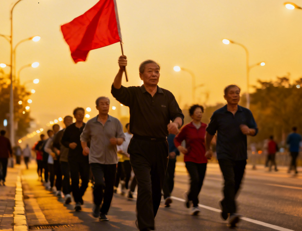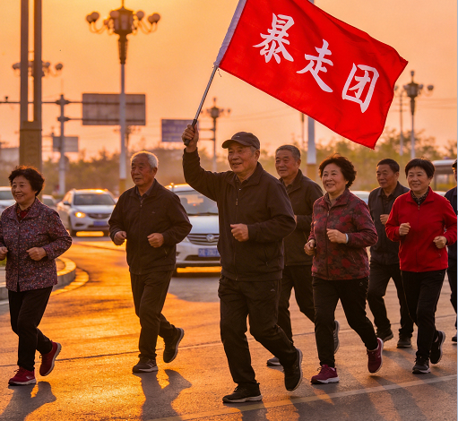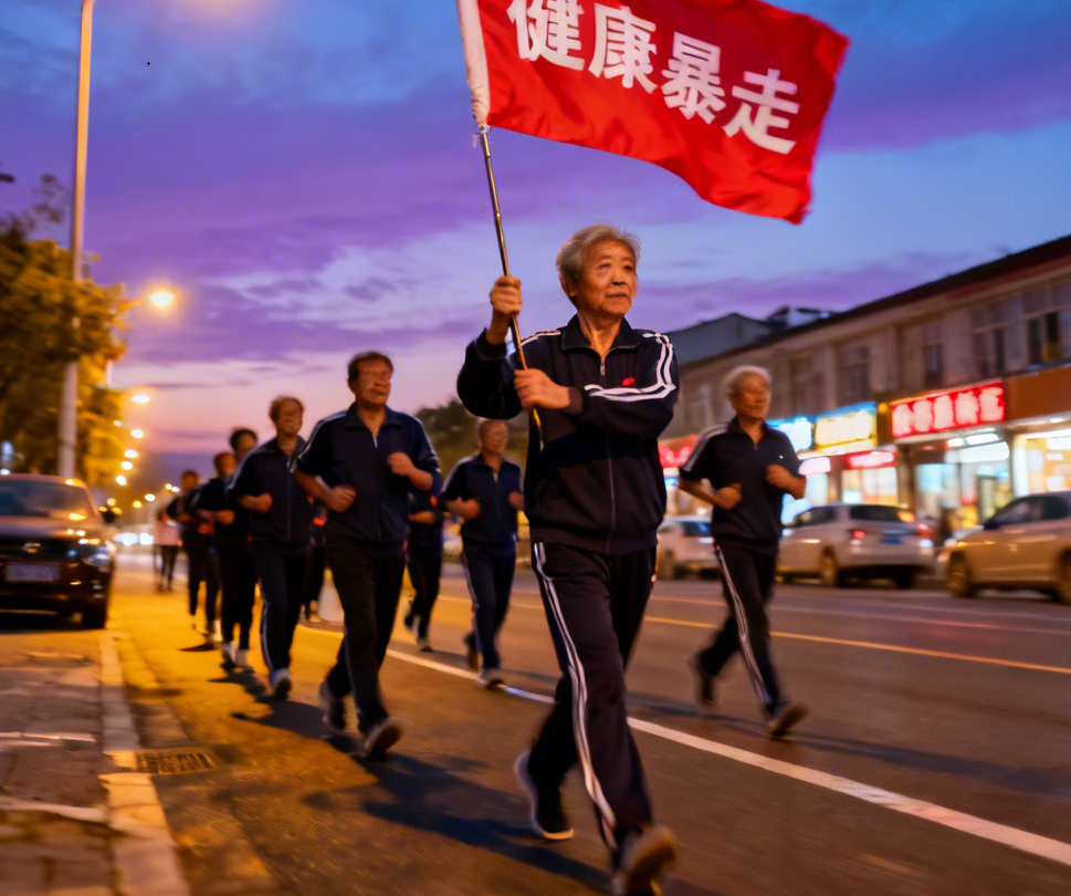 手里挥舞着那面印着健康暴走队的红旗,走得虎虎生风。