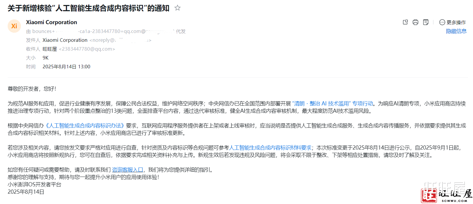 若您涉及相关内容,请您按发文要求严格对应用进行自查,针对资质及内容标识等合规问题可参考人工智能生成合成内容标识材料要求;本次标准变更于2025年8月14日进行公示,自2025年9月1日起,小米应用商店将按照新规执行,您可在自查后,依据要求完成相关资料补充与上传。新规生效后若发现违规及风险问题,将会采取不限于整改、下架等相应处置措施,请您及时了解及关注。