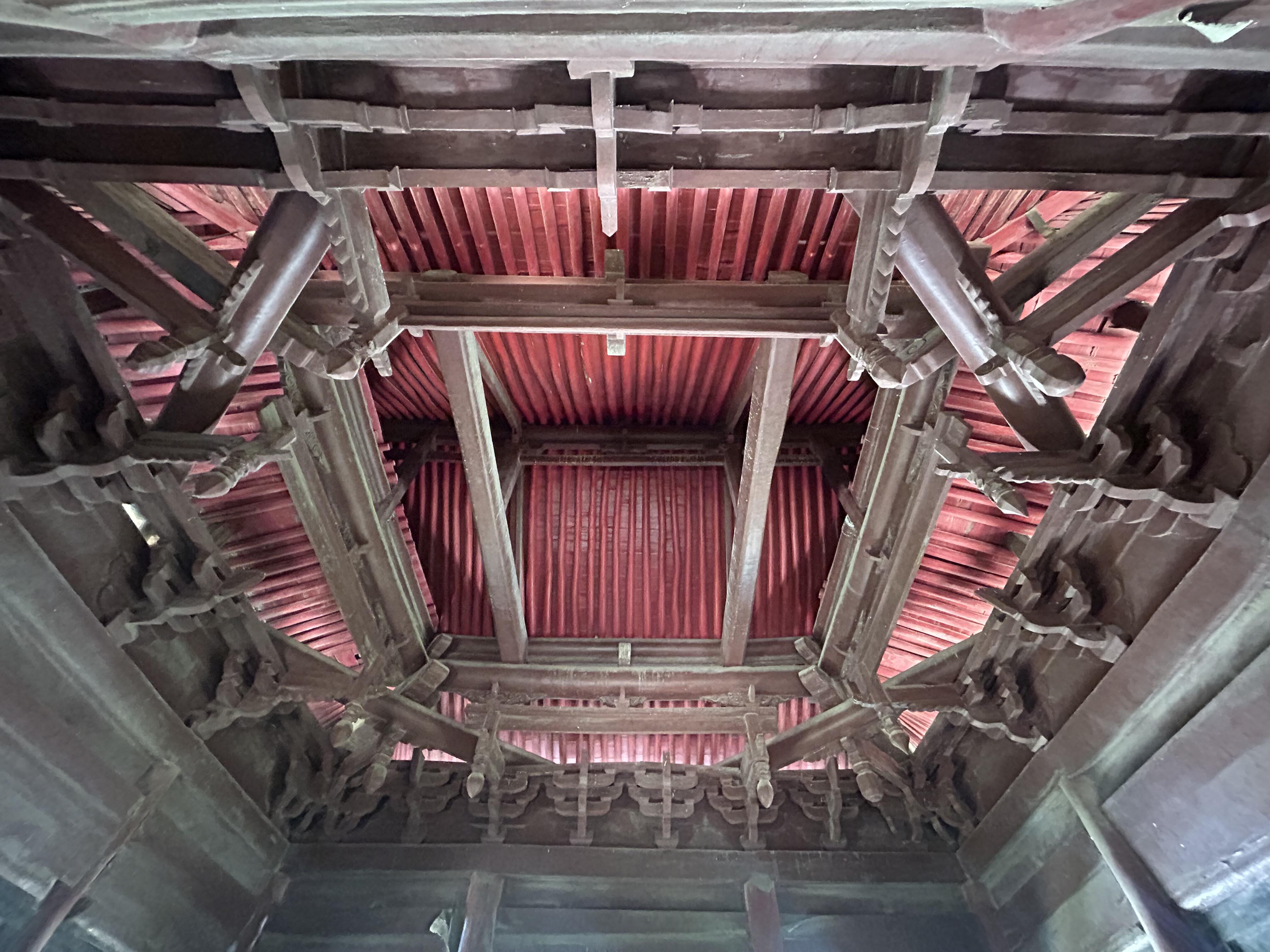 室内梁架采用三架梁四椽屋带单步梁的结构,檐下四周布满斗栱,它们像精巧的榫卯拼图,紧密又和谐。上层斗拱为五铺作,分别分布于向外檐两部分,北面有明间补间铺作各二朵,东、西、南面各一朵;中层是四铺作,南、北两面有明间补间铺作各二朵,其余各一朵;下层每间补间铺作均为一朵。九斗栱上设有要斗,拱雕饰成“三幅云”式样,二、三层斗拱均出有批竹昂。四挑角下除了挂垂,还有单头旗杆支撑,每一处细节都彰显着古代工匠的精湛技艺与独特匠心。