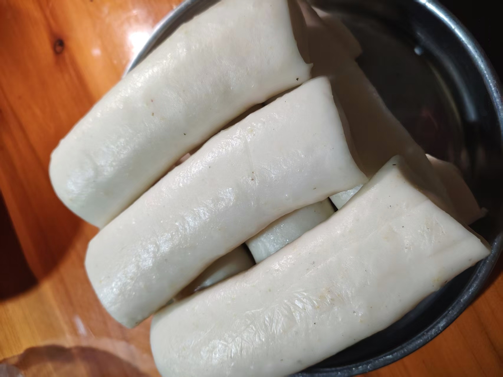 芋头糕做起来繁琐,奶奶年岁大了,手脚不如从前利落。可每次我们回家,她总要忙活上一整晚,做出满满一大块来。除了芋头糕,奶奶还会做白果。她做的白果比市面上卖的更韧,更有嚼劲,切成片炒了,或是下在火锅里,都是一道独特美味。奶奶把做好的白果“养”在水缸里,能保存好些日子。