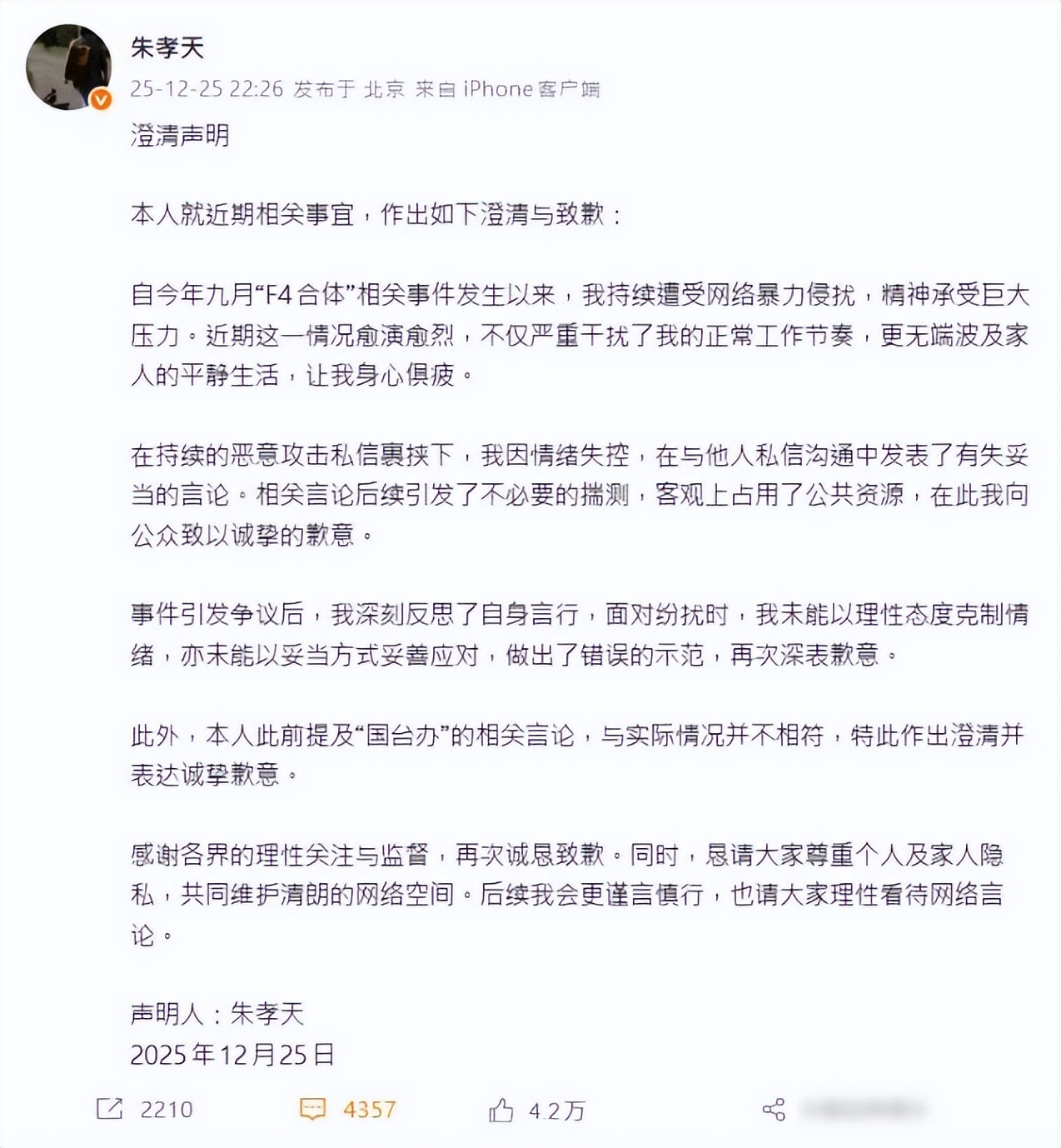 到了25号晚上,朱孝天在微博上道歉,承认自己情绪失控,也说明他并没有真的提到国台办的事情,现在还没有任何官方调查或新规定出来,大麦方面也没有承认和黄牛有联系,事情就这么暂时停下来了,但大家心里的疙瘩还在,下次再出现类似情况,估计还会爆发。