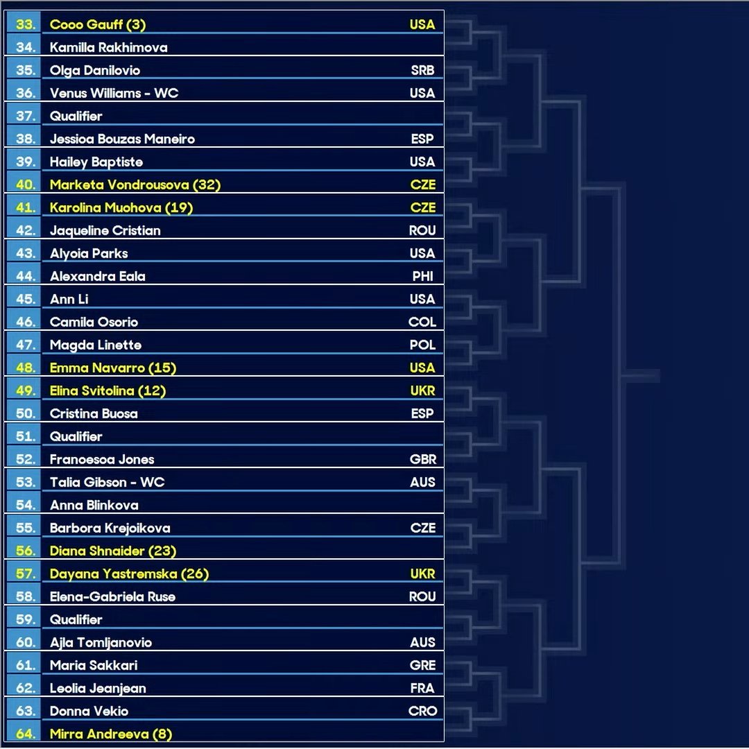 本区的两位大种子是颇有渊源的斯维泰克和莱巴金娜,两人如果能在四分之一决赛相遇,也将是球迷们最期待的比赛之一。
