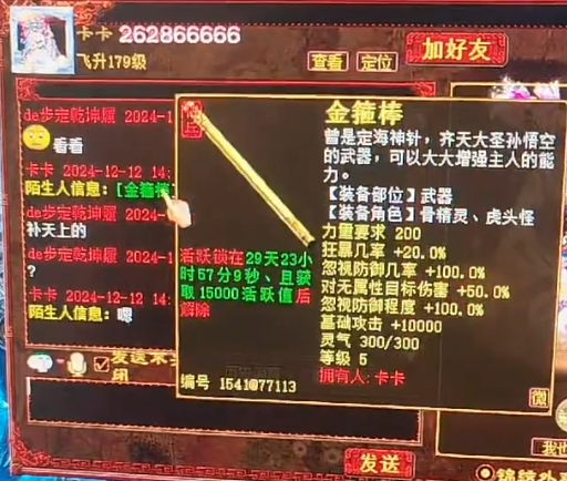 玩家给金箍棒成功冲到了五级,用补天神石直接砸,属性是狂暴破,实在是可喜可贺。