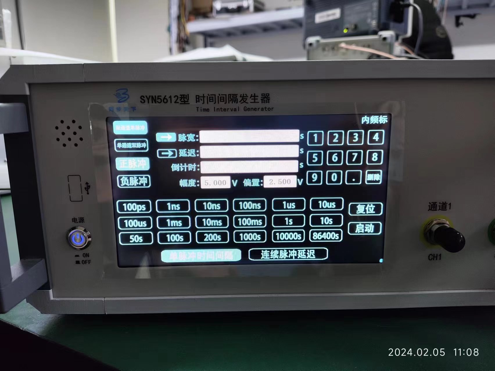 大体来讲,时间间隔发生器可以以内部恒温晶振等时基模块的振荡周期作为标准,再设置好实验需要的参数,如电压、隔直、单通道、双通道等配置,对外输出设置好的脉宽、周期、时延等由电信号组成产生的时间间隔信号。