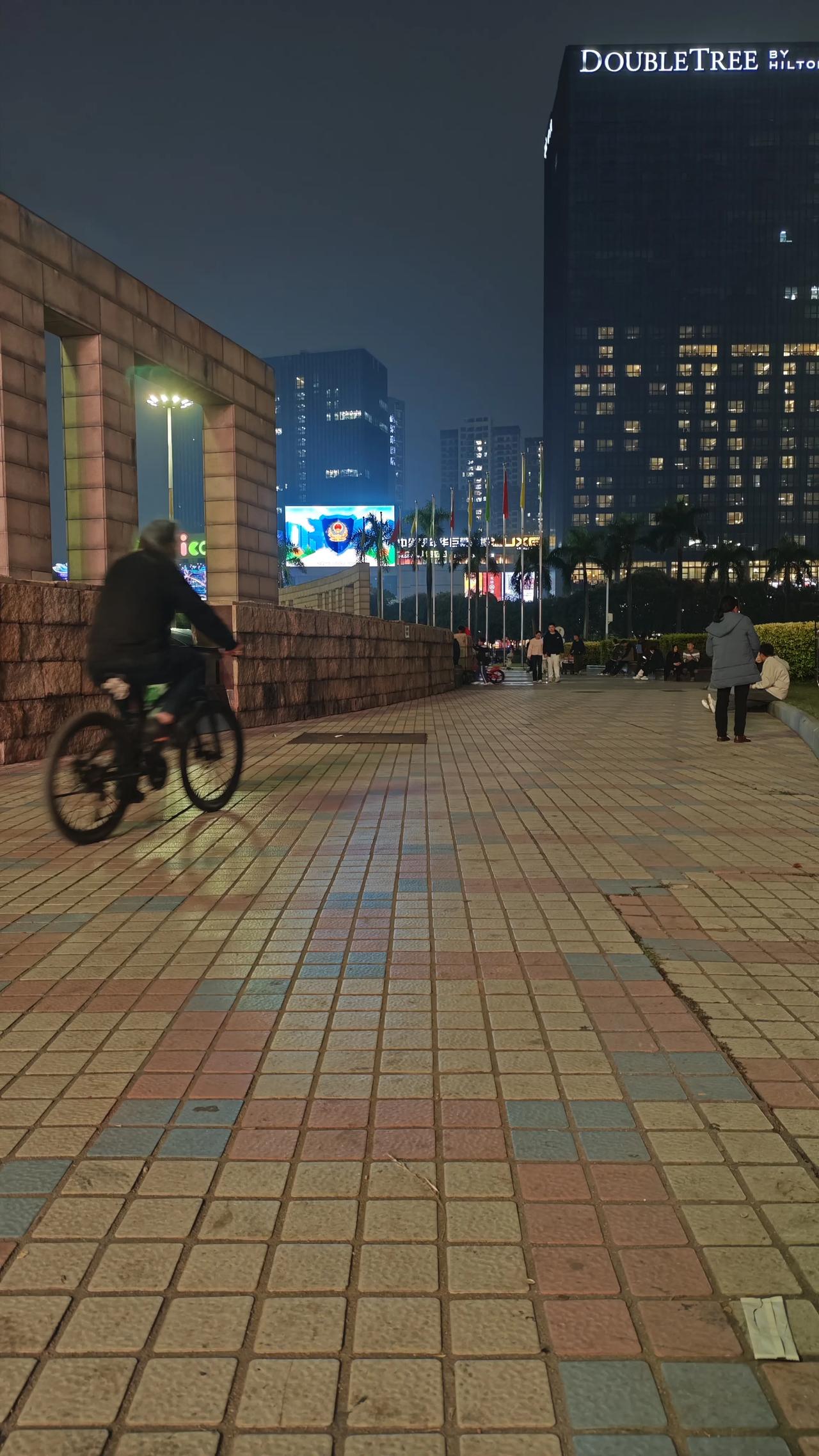 夜晚公园的宁静时光,绿草如茵,棕榈树摇曳,骑车人悠然自得。